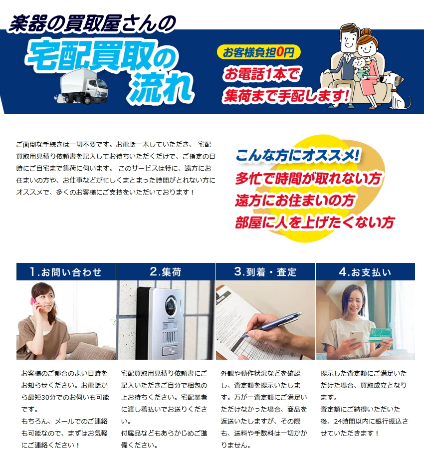 楽器の買取屋さんなら、わざわざ実店舗にまで足を運ばなくてもOKです。 - 出張買取ならその場で現金手渡し
